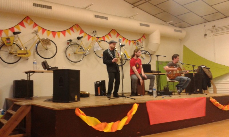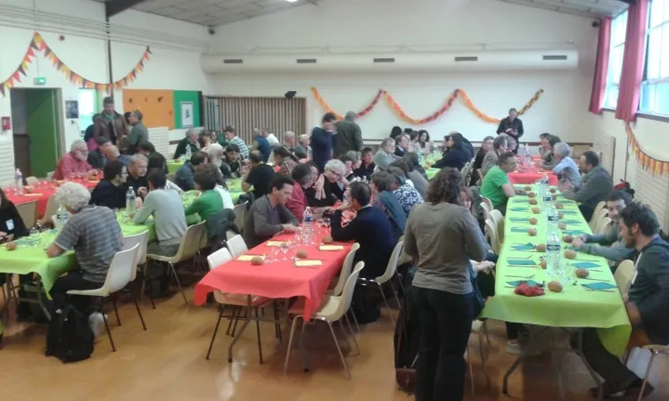 La salle du Vélodrome, décorée avec soin par des bénévoles de talents, a accueilli la soirée : repas servi par Planète Sésame et mis en musique par Otus et Bouche Cousue.